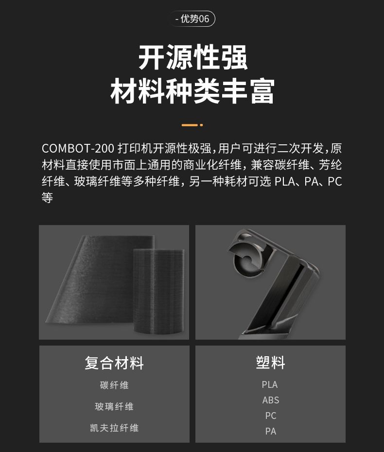 Combot 200碳纖維3D打印機,具有雙材料打印系統(tǒng),兼顧高強度與輕量化,構(gòu)建能力強,支持個性化定制,利用連續(xù)碳纖維與PLA材料等高性能材料性能構(gòu)建出高強度復合材料零件,連續(xù)打印混合材料。
