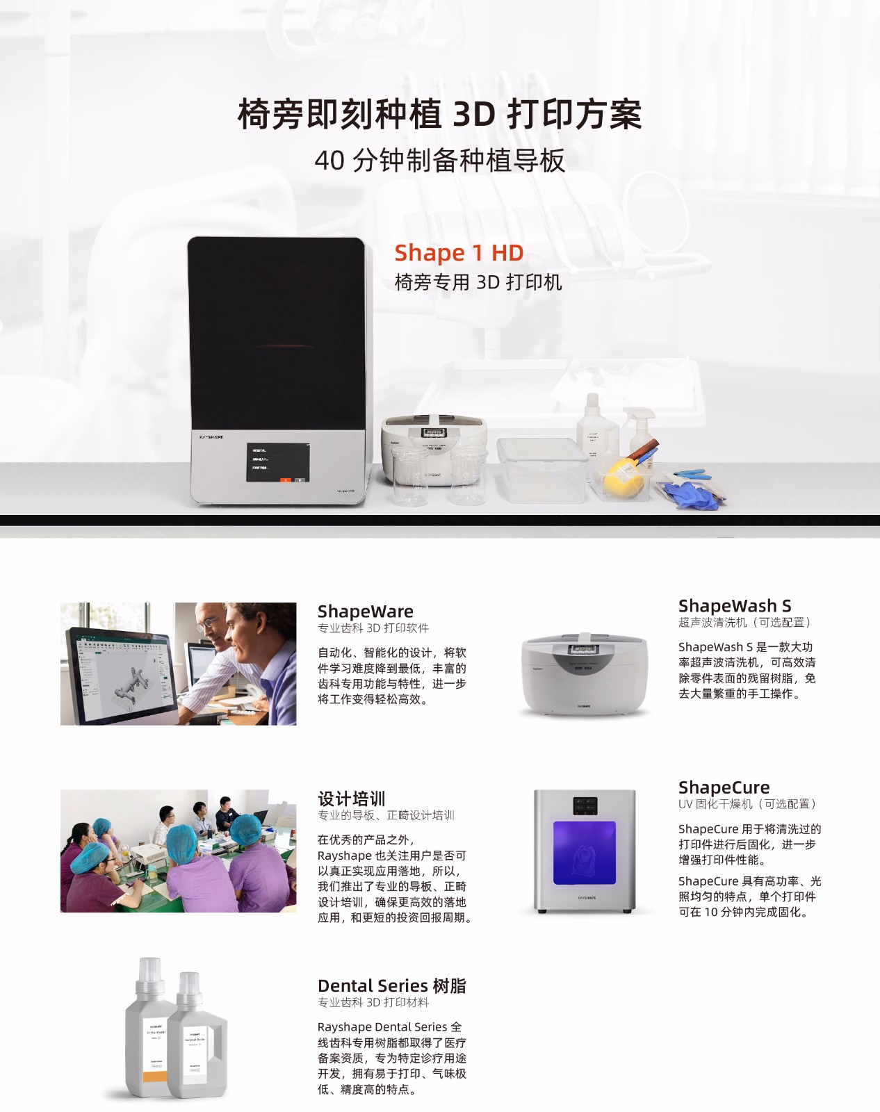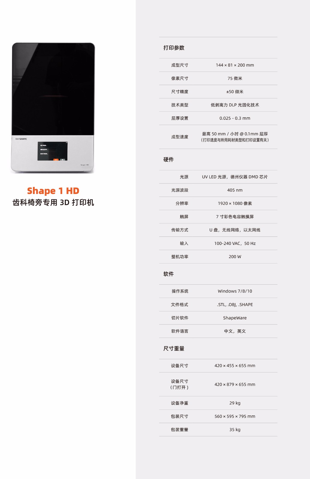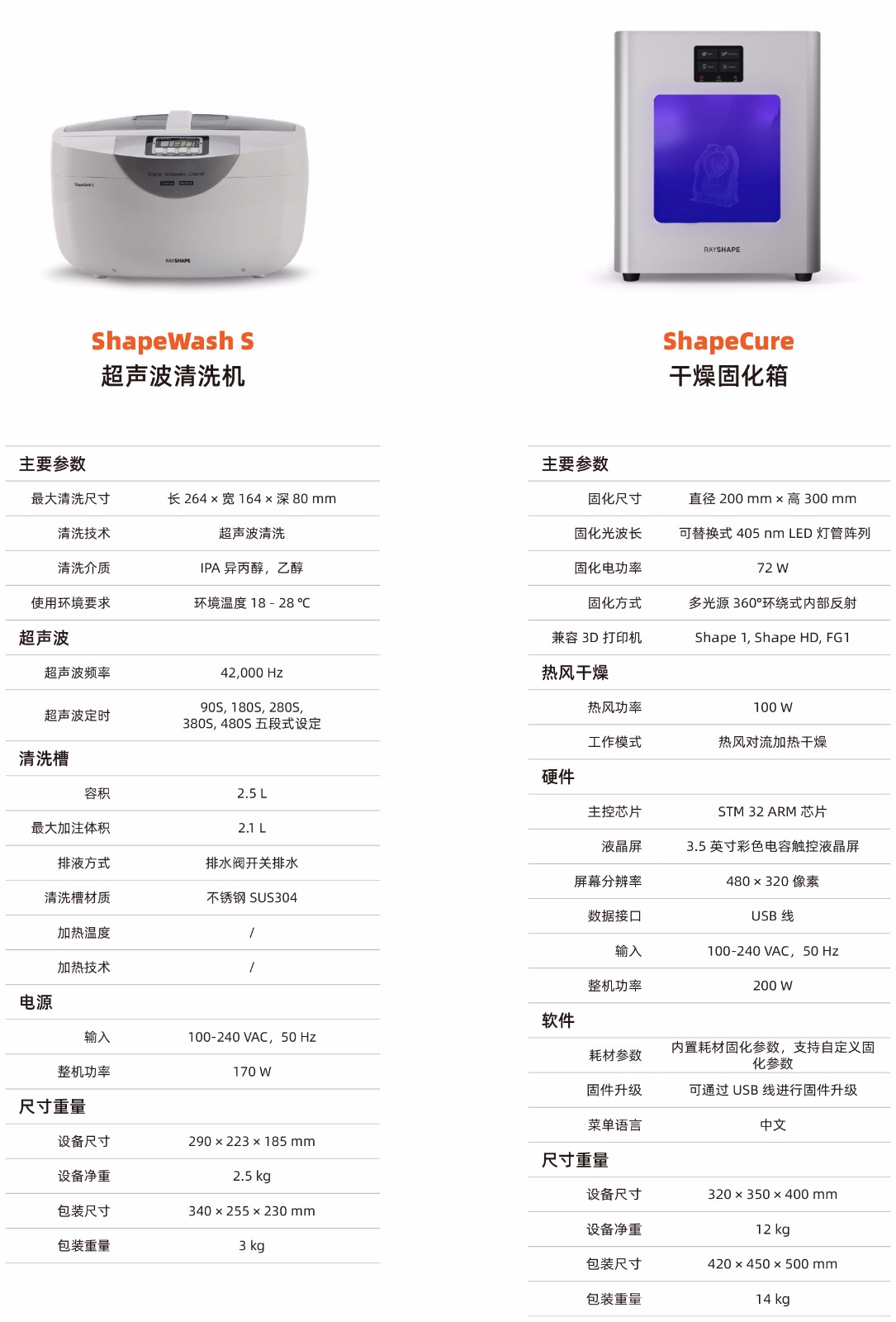 Shape 1系列3D打印機(jī)創(chuàng)新地將高速剝離技術(shù)與 DLP 數(shù)字面投影技術(shù)結(jié)合,使得 Shape 1 系列可以達(dá)到 50mm 高度 / 小時 * 的打印速度, 這意味著,單次同時打印多個 10cm 高的零件,最短只需要 2 小時。原廠三個系列共 20 款高性能光敏樹脂,且開放對第三方材料的支持可靠性與安全性并重辦公場景中使用的 3D 打印機(jī)產(chǎn)品,需要完善的設(shè)計(jì)ShapeMaterials 耗材體系涵蓋了 Basic、Functional、Dental 三個系列,可以滿足從概念原型、功能原型、模具、終端部件、醫(yī)療、文創(chuàng)、批產(chǎn)等多行業(yè)、多應(yīng)用的需求。恒溫打印倉Rayshape 全系列產(chǎn)品皆配備恒溫打印倉技術(shù),確保任何氣溫環(huán)境下光敏樹脂都能維持在最佳的粘度,避免因氣溫過低造成打印失敗。空氣凈化Rayshape 全系列 3D 打印機(jī)皆配備 HEPA 空氣凈化系統(tǒng),降低氣味,減少光敏樹脂對工作環(huán)境的影響。安全門設(shè)計(jì)打印過程中若打開倉門,打印機(jī)會立即暫停打印,最大限度降低運(yùn)動部件或激光對人造成傷害的潛在風(fēng)險。Basic 系列包含標(biāo)準(zhǔn)黑、標(biāo)準(zhǔn)灰、標(biāo)準(zhǔn)白、精密、高速,共 5 款光敏樹脂F(xiàn)unctional 系列包含韌性、剛性、耐磨、耐高溫、類硅膠、類橡膠、阻燃、防靜電、高透明、紅蠟,共 10 款光敏樹脂Dental 系列包含牙模、手術(shù)導(dǎo)板、正畸模、假牙齦、記存模,共 5 款光敏樹脂