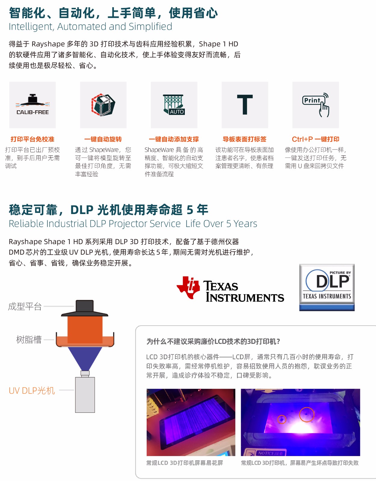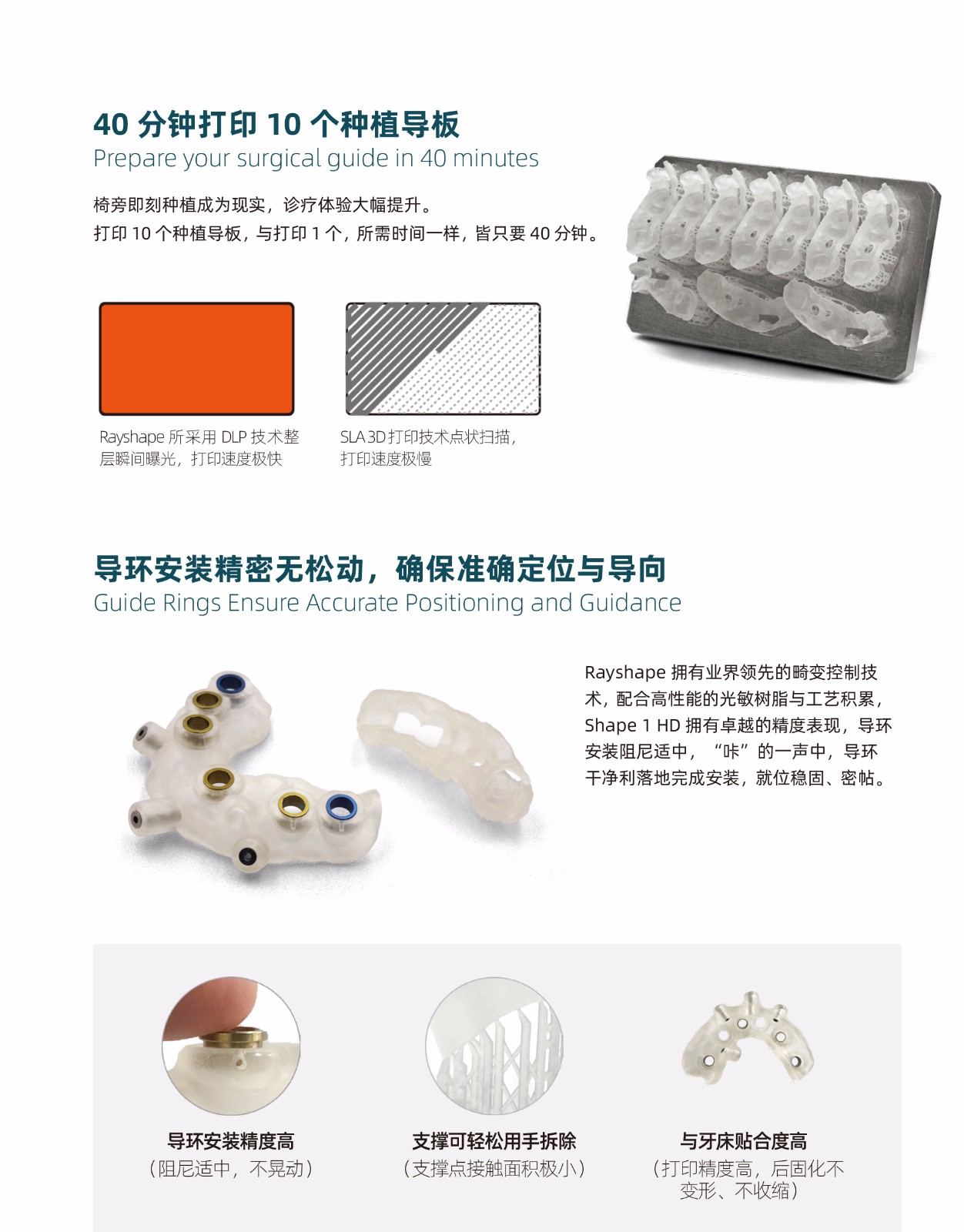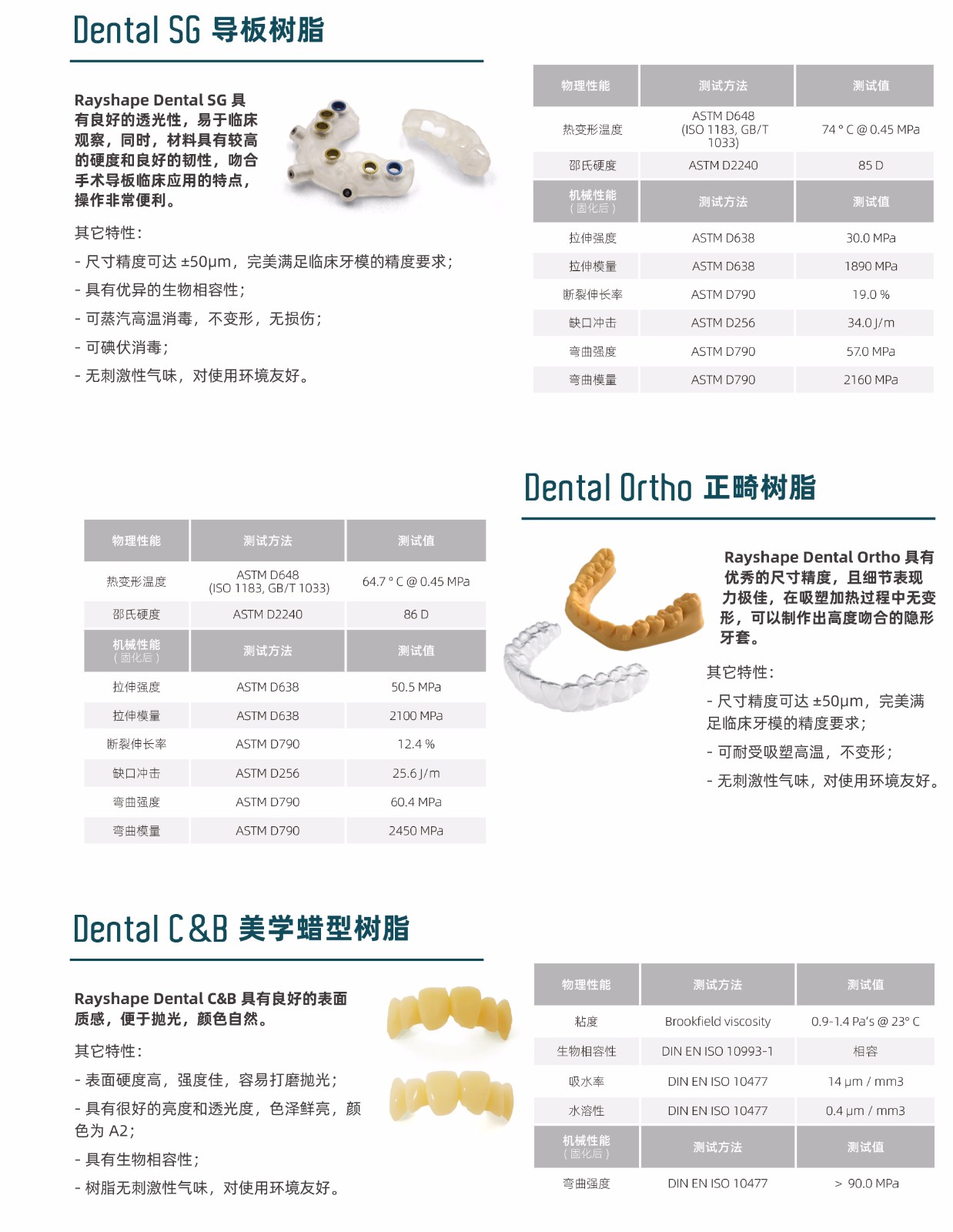 Shape 1系列3D打印機(jī)創(chuàng)新地將高速剝離技術(shù)與 DLP 數(shù)字面投影技術(shù)結(jié)合,使得 Shape 1 系列可以達(dá)到 50mm 高度 / 小時 * 的打印速度, 這意味著,單次同時打印多個 10cm 高的零件,最短只需要 2 小時。原廠三個系列共 20 款高性能光敏樹脂,且開放對第三方材料的支持可靠性與安全性并重辦公場景中使用的 3D 打印機(jī)產(chǎn)品,需要完善的設(shè)計(jì)ShapeMaterials 耗材體系涵蓋了 Basic、Functional、Dental 三個系列,可以滿足從概念原型、功能原型、模具、終端部件、醫(yī)療、文創(chuàng)、批產(chǎn)等多行業(yè)、多應(yīng)用的需求。恒溫打印倉Rayshape 全系列產(chǎn)品皆配備恒溫打印倉技術(shù),確保任何氣溫環(huán)境下光敏樹脂都能維持在最佳的粘度,避免因氣溫過低造成打印失敗。空氣凈化Rayshape 全系列 3D 打印機(jī)皆配備 HEPA 空氣凈化系統(tǒng),降低氣味,減少光敏樹脂對工作環(huán)境的影響。安全門設(shè)計(jì)打印過程中若打開倉門,打印機(jī)會立即暫停打印,最大限度降低運(yùn)動部件或激光對人造成傷害的潛在風(fēng)險。Basic 系列包含標(biāo)準(zhǔn)黑、標(biāo)準(zhǔn)灰、標(biāo)準(zhǔn)白、精密、高速,共 5 款光敏樹脂F(xiàn)unctional 系列包含韌性、剛性、耐磨、耐高溫、類硅膠、類橡膠、阻燃、防靜電、高透明、紅蠟,共 10 款光敏樹脂Dental 系列包含牙模、手術(shù)導(dǎo)板、正畸模、假牙齦、記存模,共 5 款光敏樹脂